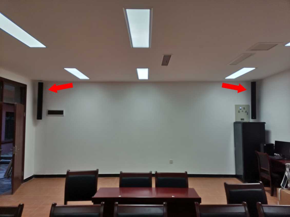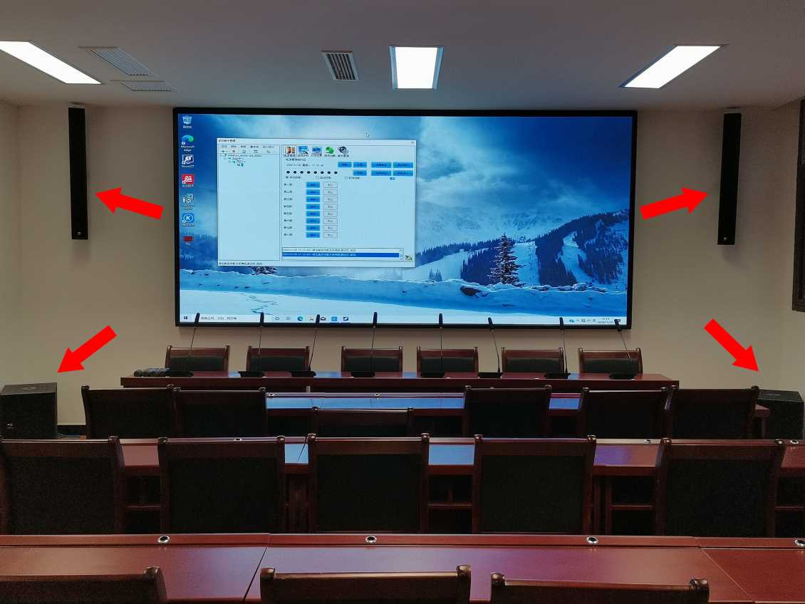 ? ? ?我们选用了四只TH-M481线性音柱和两只LA-12S低音音箱来进行扩声。线性音柱具有小箱体,大功率的特点,人声清晰饱满,还原度高。会议室采用四角壁挂的安装方式,可以保证声压级均匀合理。