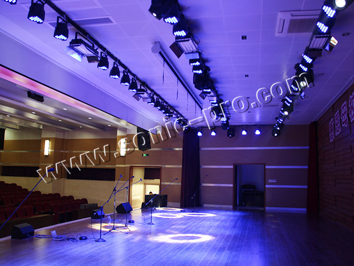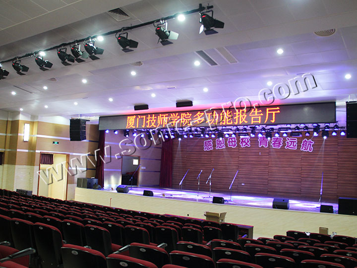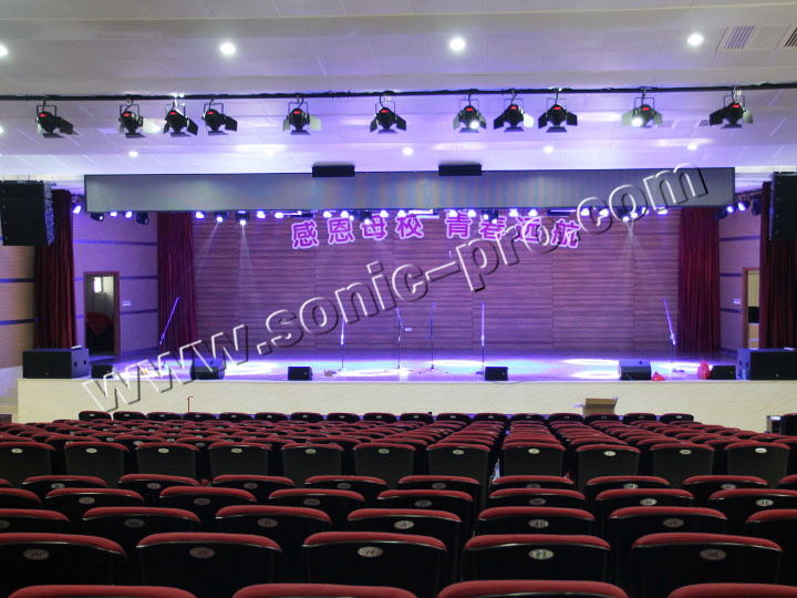 厦门技师学院多功能报告厅音响系统全部采用SONIC PRO(斯尼克)音响,左右声道扬声器组各由4只双10寸线性阵列音箱(LA-210) ,以吊挂安装扩声方式实现全频扩声,线性阵列音箱具有音质优美,传输距离远,声压级大的特点,适合大型厅堂扩声需求。同时采用4只83寸线性音柱(TH-803)作为中央通道扩声,确保中场区域扩声的直达声;另外,设计了2只双18寸的低音音箱(SUB-218)作为全场扩声的低频下潜及能量的补充,可以满足各类文艺演出表演的低音需求。为进一步确保均匀的声压级,增加了4只12寸同轴音箱(TZ-12)作为会议扩声使用时舞台后场观众席的扩声;台唇音箱采用4只8寸的音箱(K-8),舞台返听部分,根据舞台的面积,设计了2只12寸音箱作为舞台表演人员监听。