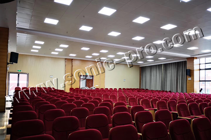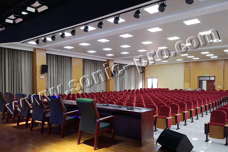音响设备是报告厅的一个重要部分,高保真地将声音播放给观众是报告厅必备的条件。报告厅作为讲演使用时,则使用对语言声音还原好的音箱,将它们放置在报告厅两侧的墙壁上。