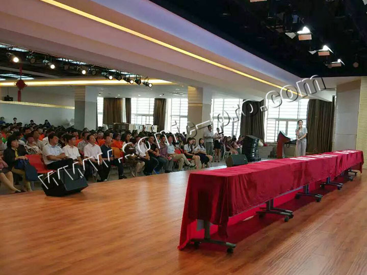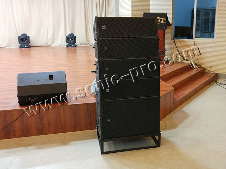 主扩采用8只LA系列双8寸线阵音箱(LA-208),线阵次低音采用2只单18寸吊挂低音(LA-118S),LA系列线阵音箱为高精度线性阵列扬声器系统,它具有较大的动态容量,能提供干净、连续、精确的高品质声音,具有高质量单元配置,专利线性号角,音质优美,投射精确等特点。舞台返听音箱采用2只TZ-12音箱。功放全部采用具有国家专利设计的MA系列(MA-2500、MA-2700),MA系列功放放大电路在先进、成熟的AB类电路基础之上做了全面的优化以及线路的调整,采用顶级功率放大管,进一部优化声音,持续提供澎湃的驱动力;同时在后面板增加了6路220V电源时序供电插座,支持远程控制开关机,使其在大中小型扩声场合时不需要匹配电源时序器。处理部分采用24路数字调音台MATRIX24.8,运用7块DSP处理芯片来保障设备强大功能的处理运算功能和稳定性、可通过USB口实现PC有线控制。配合音频矩阵处理器(MATRIX808)、均衡器(AC03)、头戴话筒(TC-200)、天线放大器(UHF-5000T)、监听音箱(M-306)等设备。