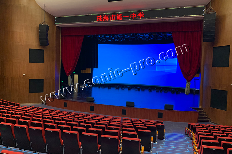 由于主扩音箱吊挂在舞台前两侧,为了确保中央扩声的声压级,我们设计了4只中置扩声音箱。