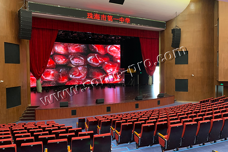 由于主音箱吊挂在舞台上空,声像整体在舞台上空,为了解决这一问题,我们采用了4只15寸拉声像音箱,隐藏摆放在舞台两侧。
