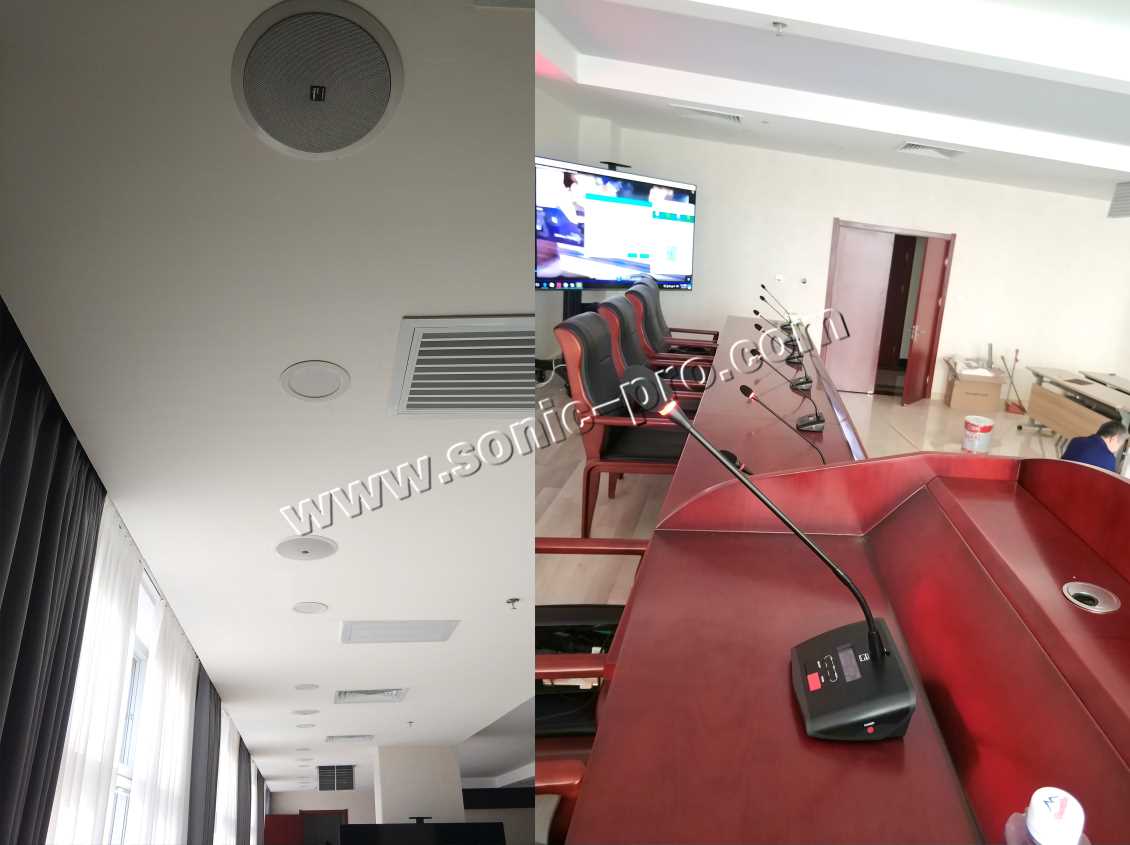 会议室扩声,重要的是让听众听到和听清发言者的讲话内容,不用关心声音是从哪里传过来的,这就要求音响系统有均匀的声场。主音箱加补声音箱的方式,显然很难实现现声场的均匀,均匀布置壁挂音箱和天花喇叭,对提高整个会议室声场的均匀度、清晰度和传声增益有非常显著的作用。