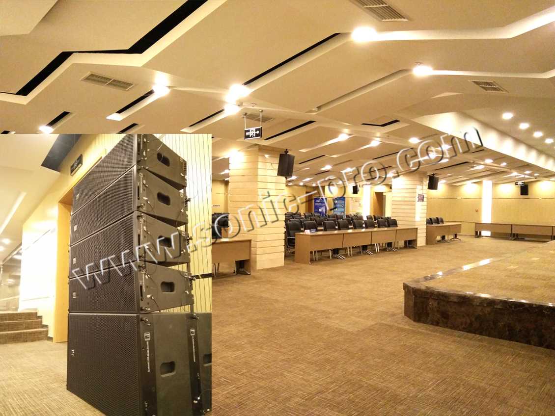 其中报告厅主要用于会议、报告、新闻发布等功能,为了满足以上活动顺利而高质量的进行,更考虑到使用方更方便、更科学的管理、操作设备。项目左右主扩音箱采用8只双8寸线性阵列音箱(LA-208)