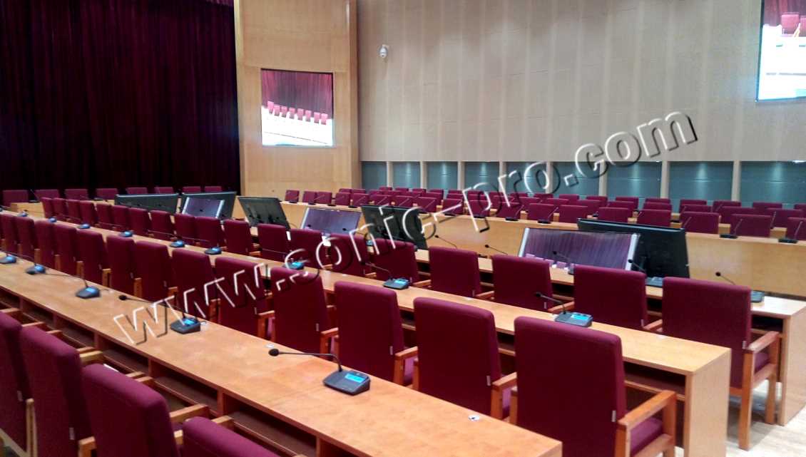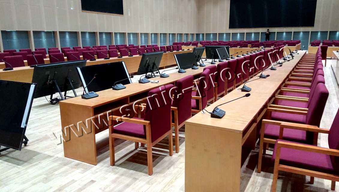 手拉手会议系统采用带摄像跟踪、讨论功能的TL3000,和高清摄像球(TL-S02)实现视像跟踪功能,使用到一百多只桌面式话筒,通过技术处理,很好的解决了话筒供电及啸叫问题。