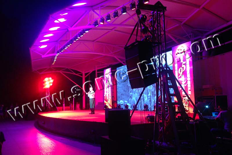 该项目主扩音箱采用8只高精度线性阵列扬声器系统LA系列线性阵列音箱(LA-210),LA系列音箱采用内置分频方式,经过严谨的调试,能充分有效的发挥音箱本身特点,箱体采用高强度桦木夹板,表面采用特殊材料喷涂制作,音箱上装备精密的铝合金吊挂系统,音箱与音箱之间的连接角度可通过吊装件来调节,采用最新人体工程学和机械设计,使整个系统安装快捷及保证了安全。TZ系列同轴音箱(TZ-18)、SUB系列超低音箱(SUB-218)、TB系列音箱(TB-15)作为辅助扩声以及舞台返听音箱。功率放大器采用节能环保的TD系列(TD-400、TD-800)和具有国家专利设计的MA系列(MA-210K)。搭配MX系列调音台(MX24C)、音频矩阵处理器(MATRIX408)、均衡器(AC03)、音频隔离器(GL-202)、电源时序器(CS-10)、天线放大器(UHF-5000T)、无线手持/头戴话筒(UHF-5000)、立杆话筒(TL508)等设备。