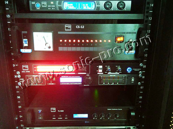 搭配2台具有高效转换率的4通道数字功放(D-4300),保证扩声能有足够能力,配合12路数字调音台(GL-24)、数字音频处理器(MATRIX 204)及智能反馈抑制器(DGL-2408)使得音色更加细腻出众,
