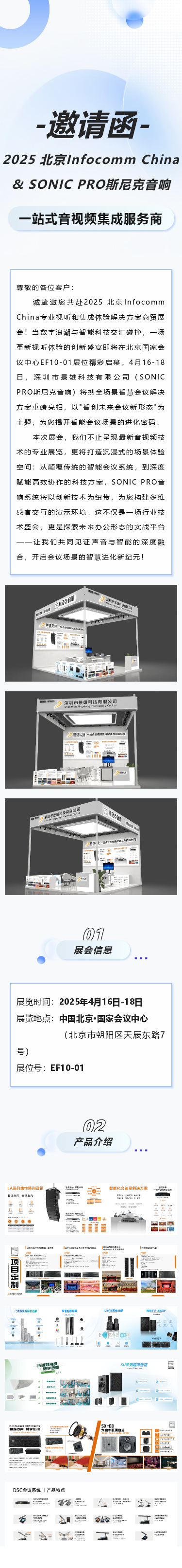 邀请函 | 2025 北京Infocomm China、SONIC PRO斯尼克音响:一站式音视频集成服务商 来源:本网原创 作者:景雄 时间:2025-04-07 14:20:00 访问次数:64 邀请函 | 2025 北京Infocomm China、SONIC PRO斯尼克音响:一站式音视频集成服务商