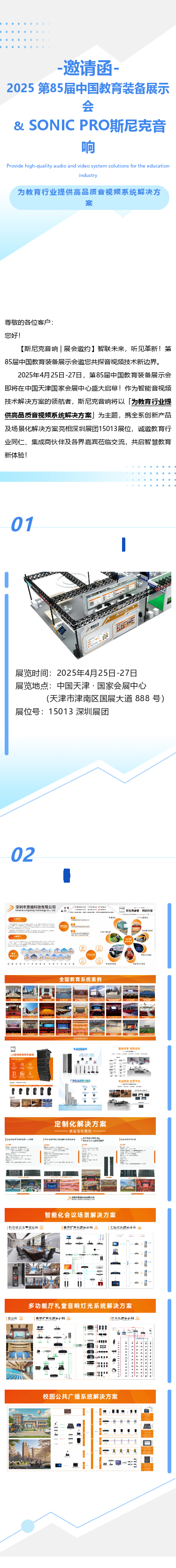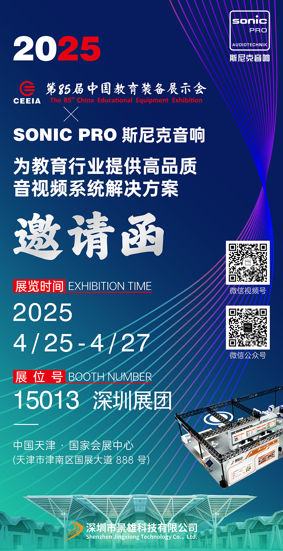 邀请函 | 2025 第85届中国教育装备展示会、SONIC PRO斯尼克音响:为教育行业提供高品质音视频系统解决方案 来源:本网原创 作者:景雄 时间:2025-04-21 17:46:00 访问次数:64 邀请函 | 2025 第85届中国教育装备展示会、SONIC PRO斯尼克音响:为教育行业提供高品质音视频系统解决方案