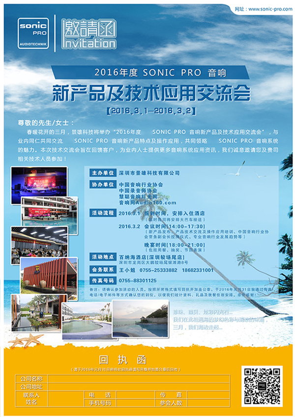 新产品及技术应用交流会 来源:本网原创 作者:景雄 时间:2021-4-30 14:18:00 访问次数:49 时间:2015-12-29?2016年度SONIC? PRO音响新产品及技术应用交流会诚邀您的莅临尊敬的先生/女士:春暖花开的三月,景雄科技将举办2016年度SONIC? PRO音响新产品及技术应用交流会,与业内同仁共同交流SONIC? PRO音响新产品特点及操作应用,共同领略SONIC? PRO音响系统的魅力。本次技术交流会旨在回馈客户,为业内人士提供更多音响系统应用资讯,我们诚意邀请您及贵司相关技术人员参加!