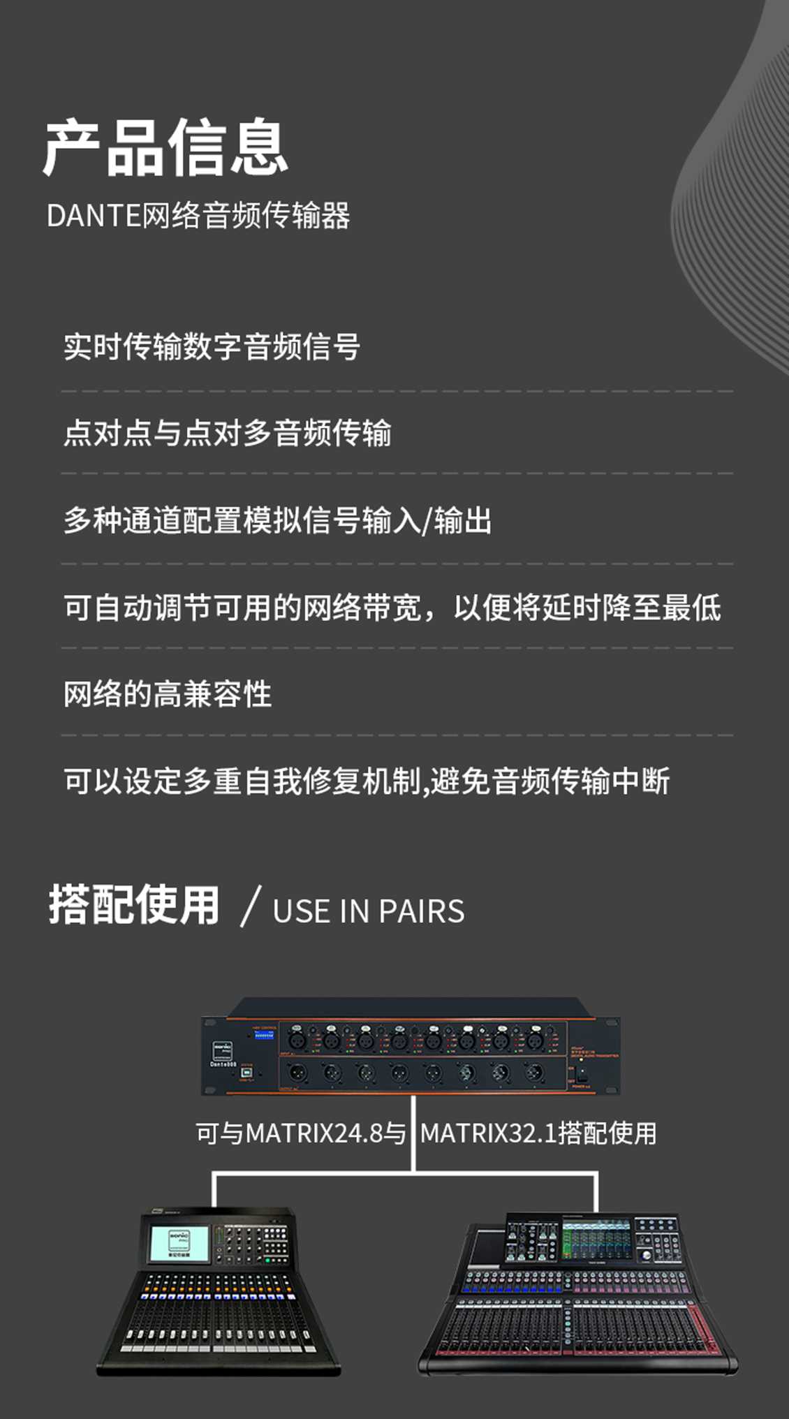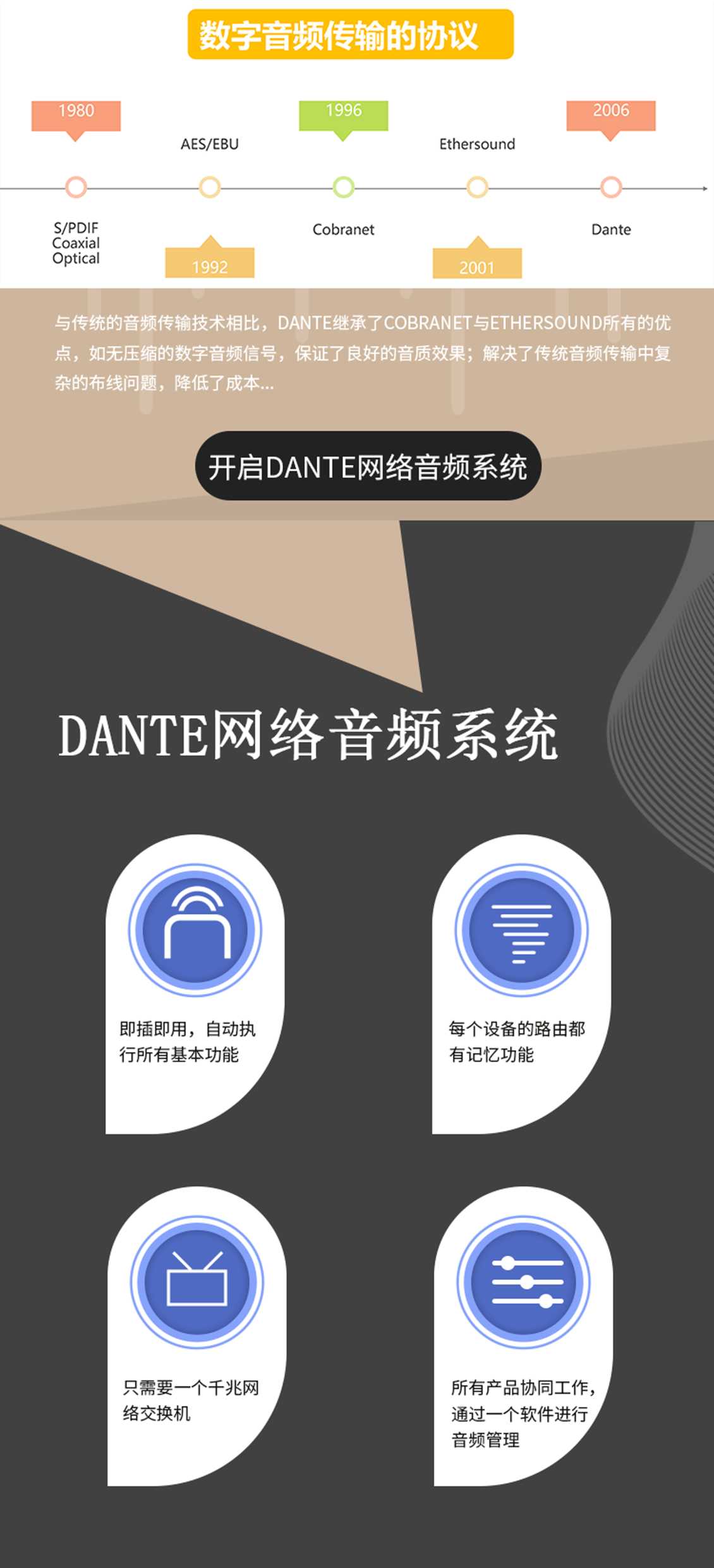采用DANTE有源系统,DANTE网络音频传输器,信号全部通过CAT5网线传输,保证高品质的音频信号远距离传输,且通过网口可实现多只音箱级联音频传输,具有连接快速,便捷的优点;最大限度减少音频信号之间的相互干扰;