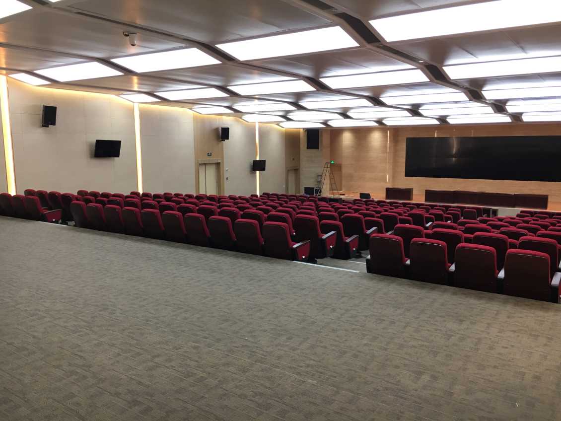 会议室可同时满足200多人进行会议,需要满足日常会议扩声需求,因此对音箱的声压级和重放的语言清晰度要求比较严格;且配有拼接大屏,应用的音响设备必须要能够与大屏联动使用;