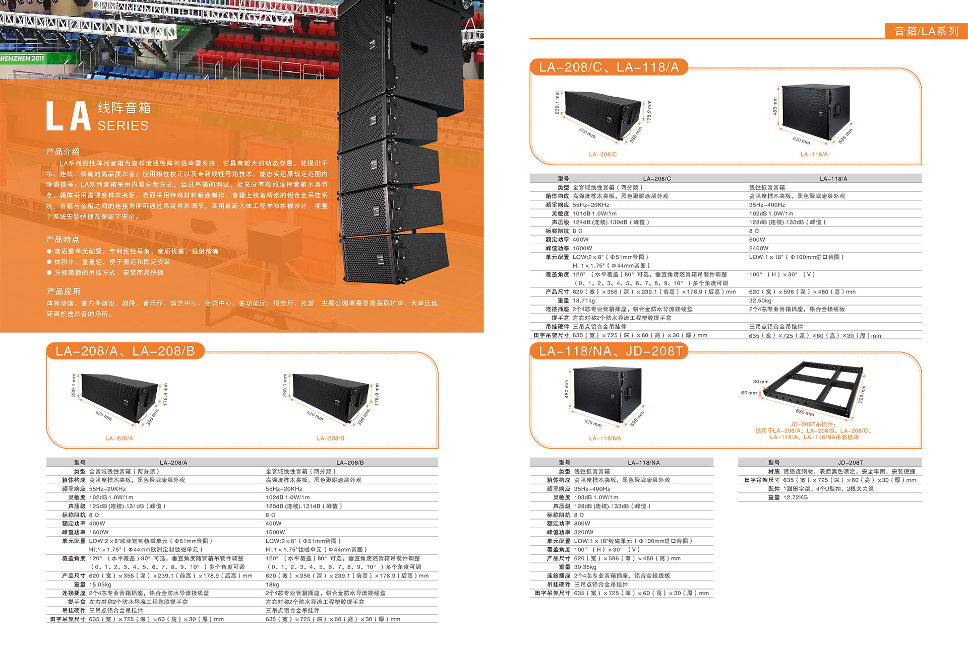 LA系列线性阵列音箱为高精度线性阵列扬声器系统,它具有较大的动态容量,能提供干净、连续、精确的高品质声音;应用相位校正以及专利线性号角技术,能忠实还原规定范围内频谱信号;LA系列音箱采用内置分频方式,经过严谨的调试,能充分有效的发挥音箱本身特点,箱体采用高强度桦木夹板,表面采用特殊材料喷涂制作,音箱上装备精密的铝合金吊挂系统,音箱与音箱之间的连接角度可通过吊装件来调节,采用最新人体工程学和机械设计,使整个系统安装快捷及保证了安全。