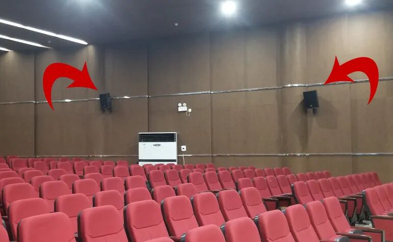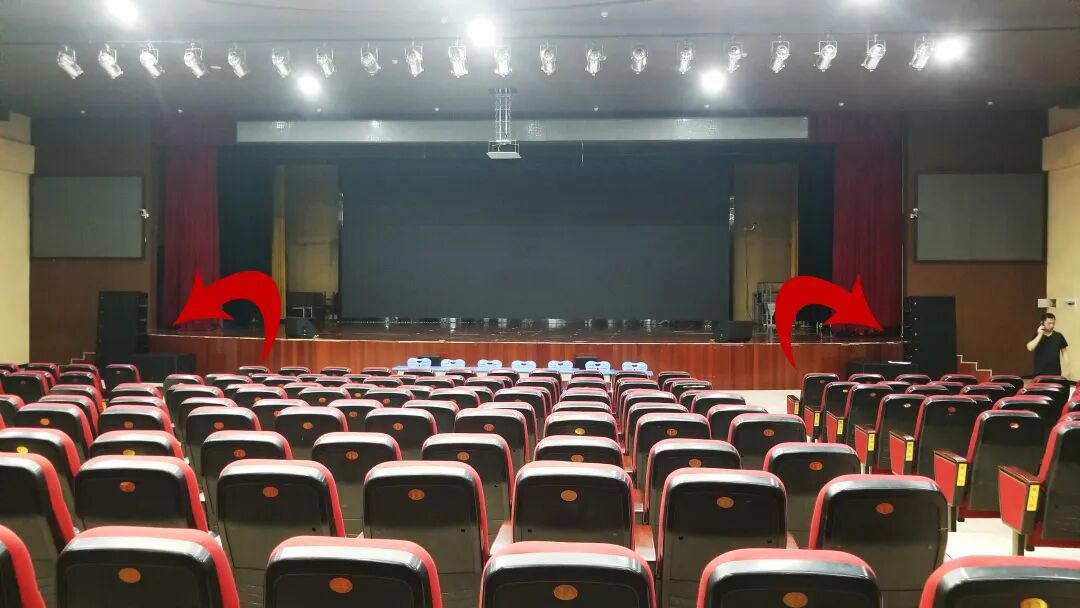 根据多功能报告厅的房间高度和阶梯型观众席,主扩声我们一边设计了6只双10寸线性阵列扬声器,线性音箱具有精准投射的优势,落地摆放在舞台前,保证了阶梯型观众席声音覆盖均匀。12只线性音箱可以提供会议语言类使用时,声音清晰干净,演出时可以提供大声压、震撼的扩声。