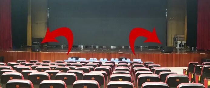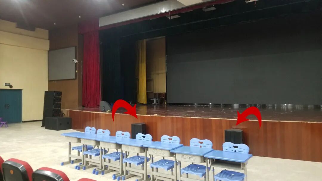 由于主音箱摆放在舞台两侧和舞台较宽,观众区中前场区域会出现声压级不足的情况,我们配置了2只台唇音箱摆放在舞台下方。