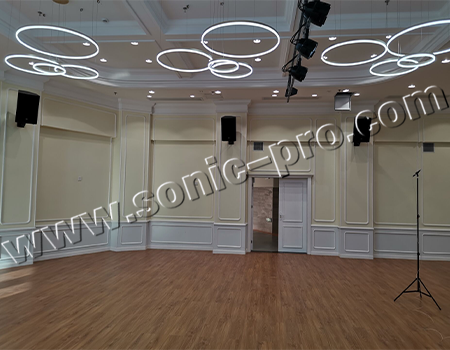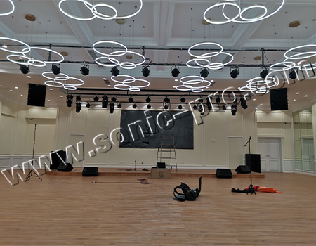 小剧场使用特点是,面积较大,需要实现远距离,大声压的扩声,因此我们配置了左右主扩声音箱,一边采用四只线性阵列音箱,高品质的喇叭单元配置,提供高音顺滑,中音通透,低音饱满的扩声。